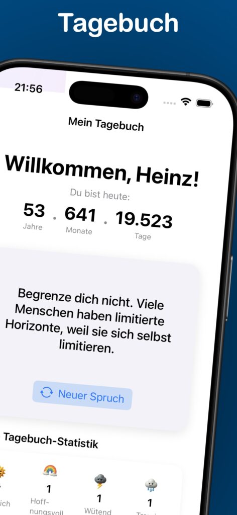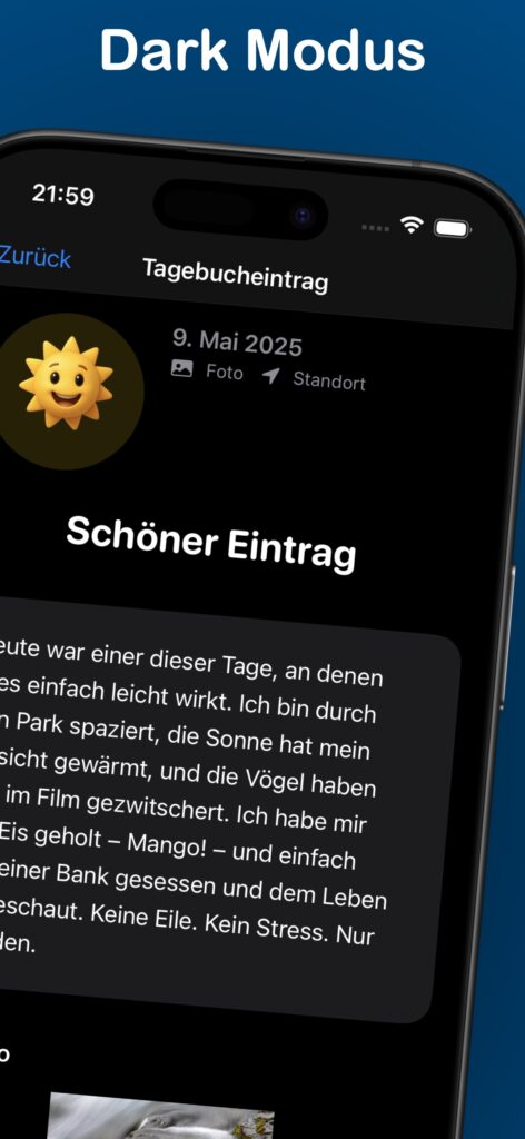 • Tägliche Einträge mit Stimmungsverfolgung • Visuelle Darstellung deiner Stimmungsentwicklung • Fotos zu deinen Einträgen hinzufügen • Standorterfassung für Erinnerungen an besondere Orte • PIN-Schutz für Privatsphäre und Sicherheit • Motivierende Zitate für positive Inspiration • Übersichtliche Kalenderansicht deiner Einträge • Dunkelmodus-Unterstützung • iCloud-Integration für sichere Datenspeicherung • Teile ausgewählte Einträge mit Freunden • Universal-App: Optimiert für iPhone und iPad