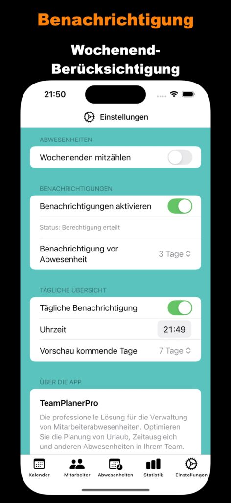 Intelligentes Benachrichtigungssystem Tägliche Übersicht der Abwesenheiten Erinnerungen vor beginnenden Abwesenheiten Anpassbare Benachrichtigungszeiten Priorisierte Wichtigkeit der Mitteilungen